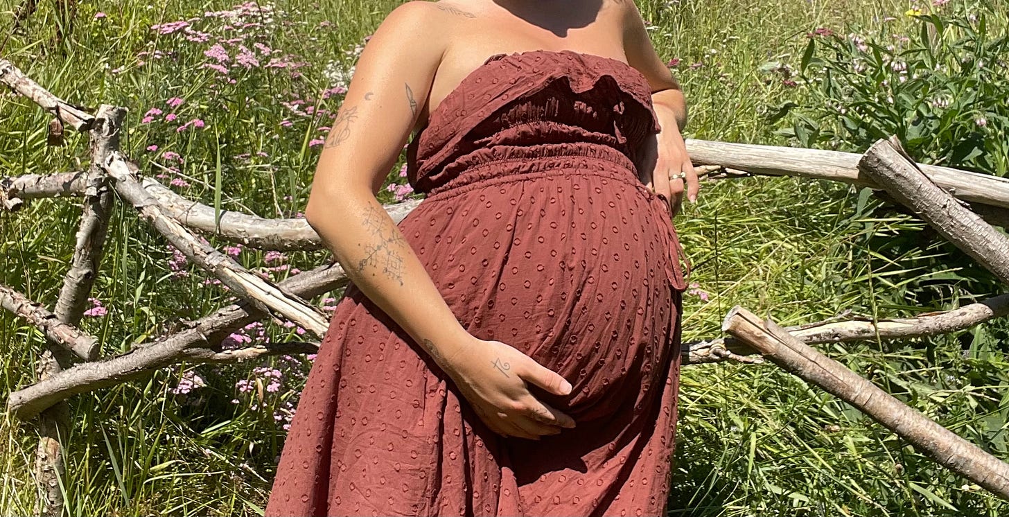 Once upon the last turning of the seasons, under a sky held within the reborn moon and a still midsummer night, my body began to quiver in anticipation of my descending baby. The moment had neared and was arriving at last. At that time, my belly had ballooned out to massive proportions compared to my petite figure. I walked with a whole world expanding out from my womb. Rippling with life. Mountains formed upon the curvature of my features. I heaved and huffed and groaned and moaned. Yet my body willfully conformed to its new demands. It glowed rosy with joy and my booming belly fluttered with delight.